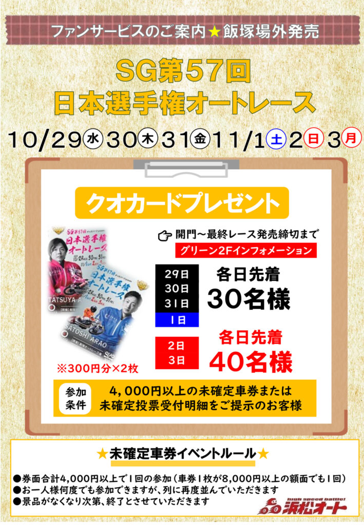 【ファンサービスのご案内】飯塚「SG第57回日本選手権オートレース」場外発売 QUOカードプレゼント