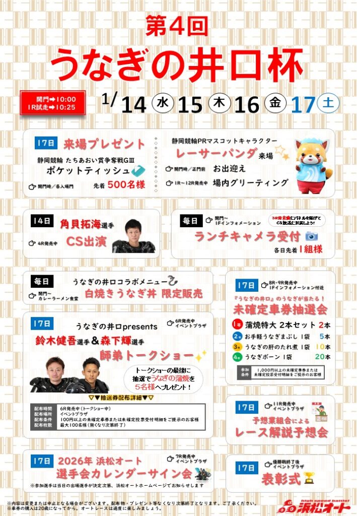 【本場開催のご案内】1月14日~1月17日「第4回うなぎの井口杯」レース情報&イベントのお知らせ!