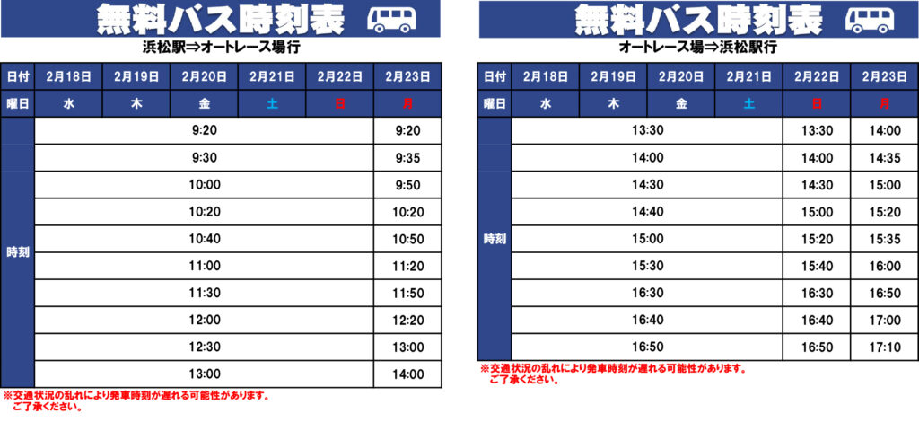 浜松駅⇔浜松オートレース場 の無料バスは浜松オート本場開催時のみ運行となります