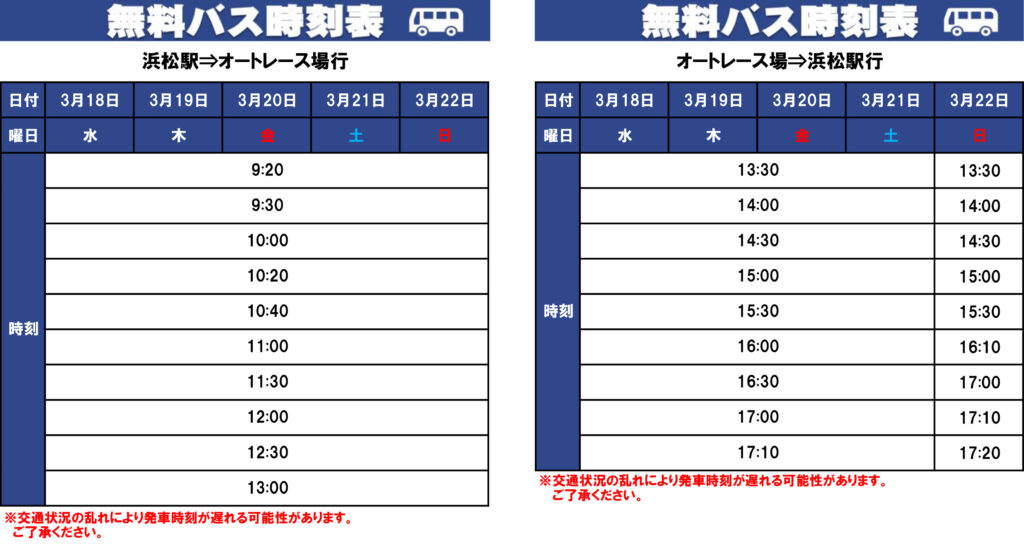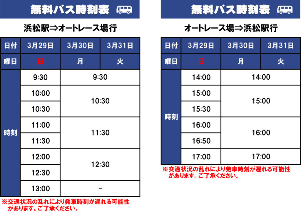 浜松オート無料バス(本場開催日のみ) 運行時刻表